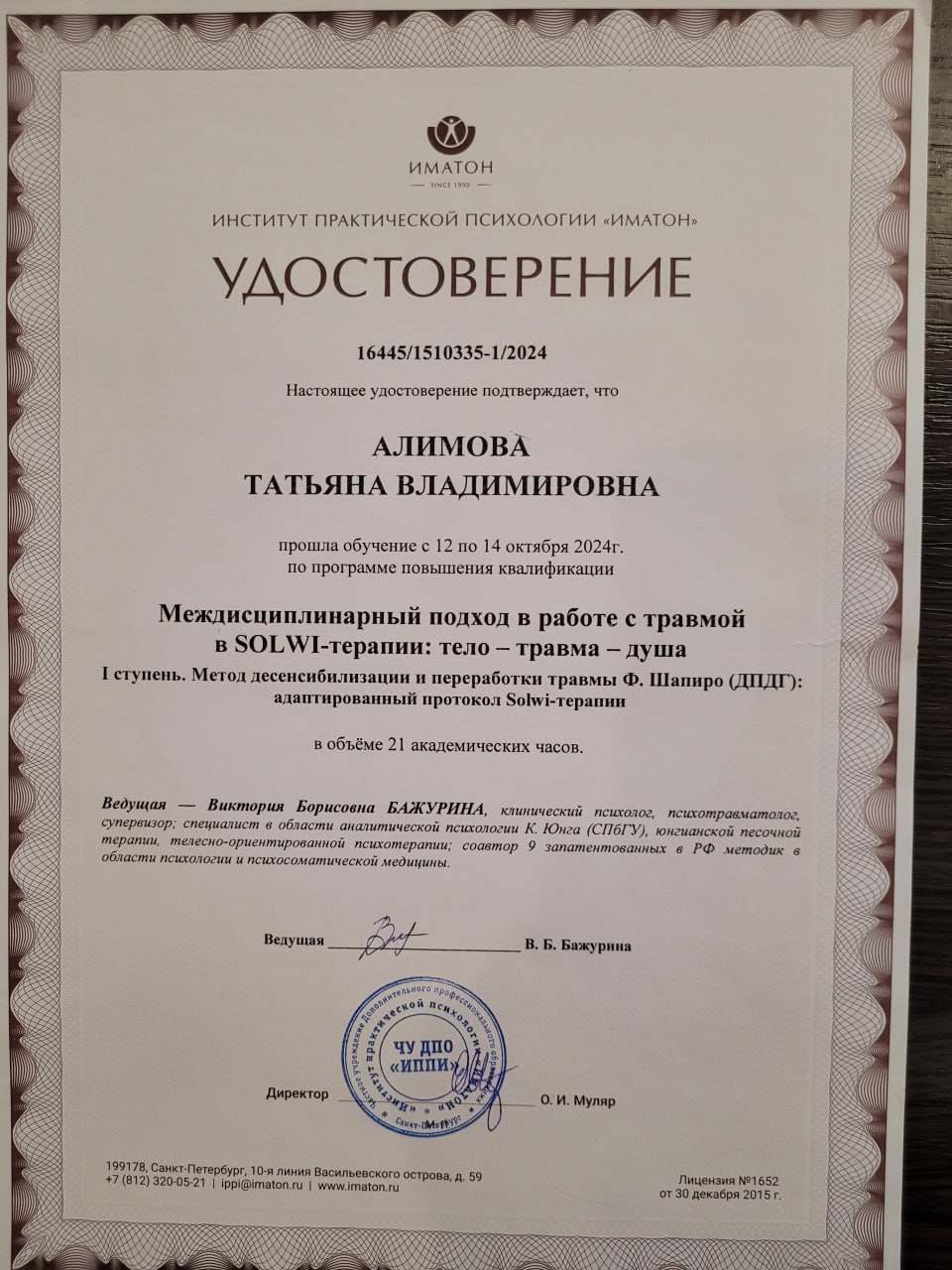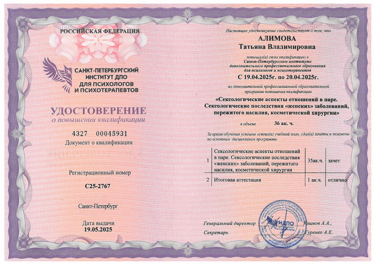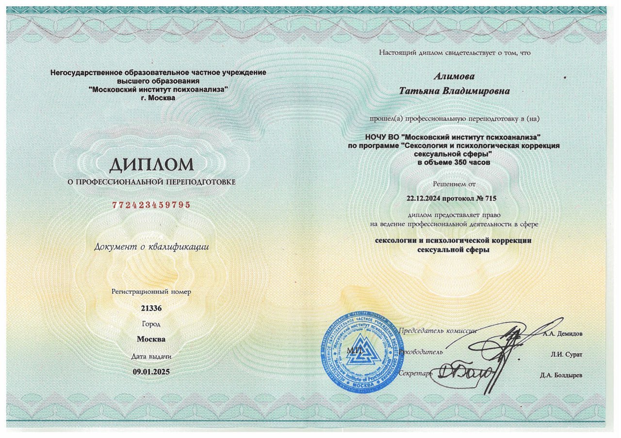 Здравствуйте, меня зовут Татьяна Алимова, я клинический психолог, сексолог Когда я только начинала работать клиническим психологом, ко мне приходили с самыми разными запросами: тревога, депрессия, кризисы в отношениях. Но вскоре я заметила удивительную закономерность - примерно половина клиентов так или иначе сталкивались с: • Невысказанными вопросами о своей сексуальности • Болезненными стереотипами, усвоенными с детства • Конфликтами в паре на почве интимной жизни • Последствиями травм, мешающими близости Тогда я поняла: люди готовы обсуждать с психологом что угодно - кроме этого. Хотя именно здесь часто кроются корни проблем. Сейчас я помогаю: ✓ Разбираться с сексуальными дисфункциями (отсутствие желания, боли, проблемы с возбуждением) ✓ Восстанавливать доверие и взаимопонимание в парах ✓ Преодолевать последствия травм и токсичного опыта ✓ Принимать свою сексуальность без стыда и страха Моя позиция: Нет "нормальных" и "ненормальных" желаний - есть ваша уникальная история. Мы будем работать не только с симптомами, но и с причинами. Если вы: Чувствуете, что "что-то не так", но боитесь об этом говорить Устали от непонимания себя Беспокоитесь из-за неудач в постели У вас нет желания заниматься сексом Ваша вторая половина предъявляет вам претензии по поводу секса Записывайтесь на консультацию мы обязательно найдем выход.